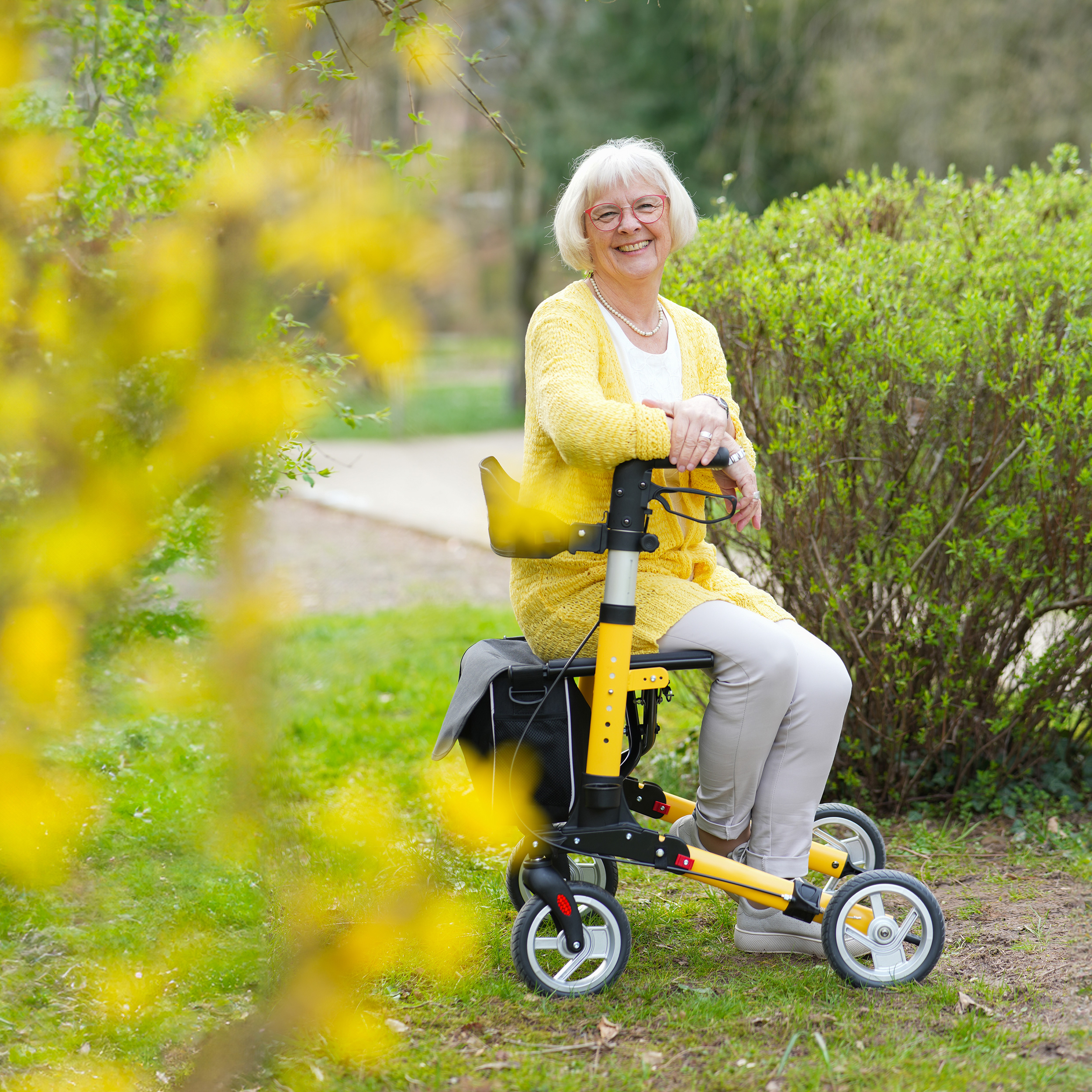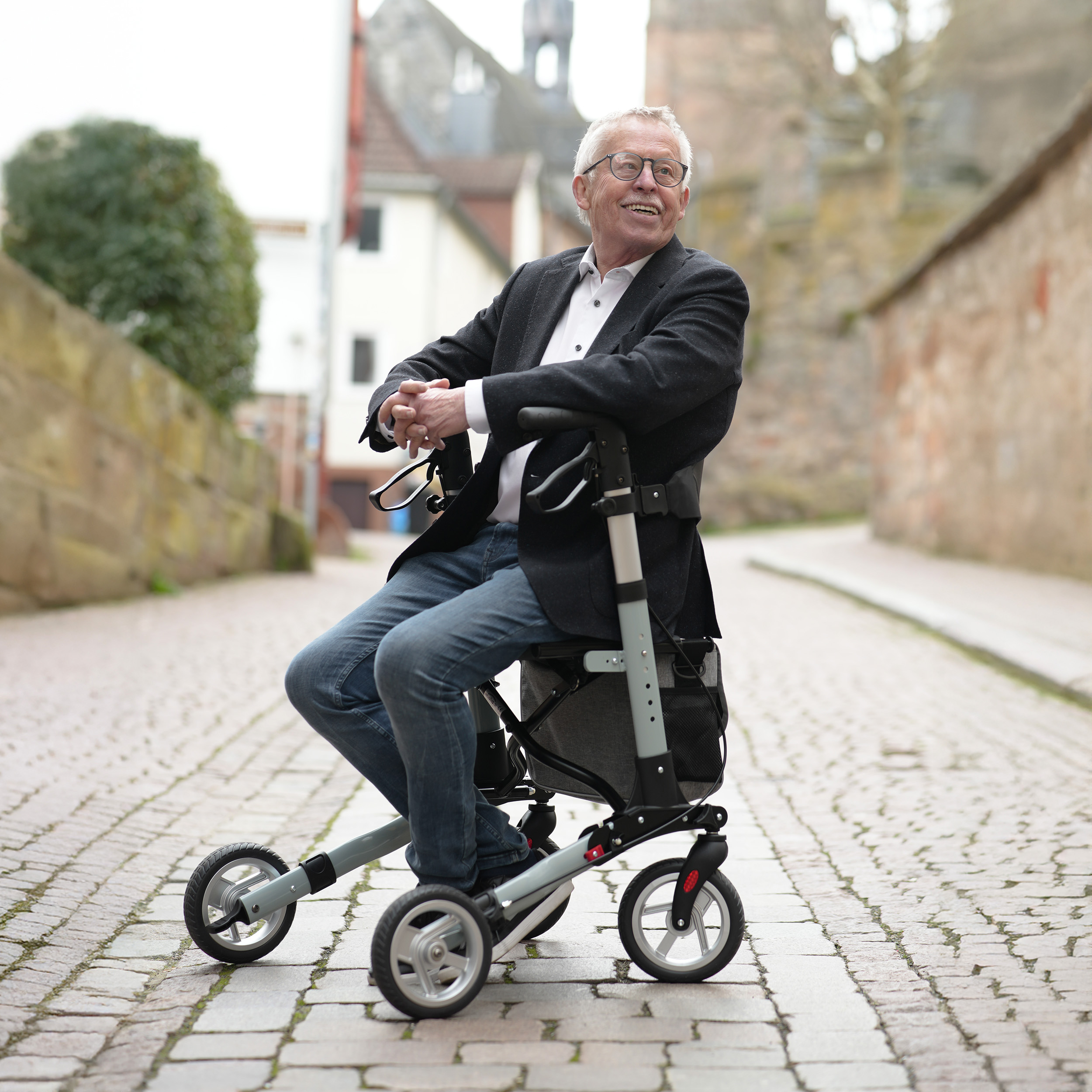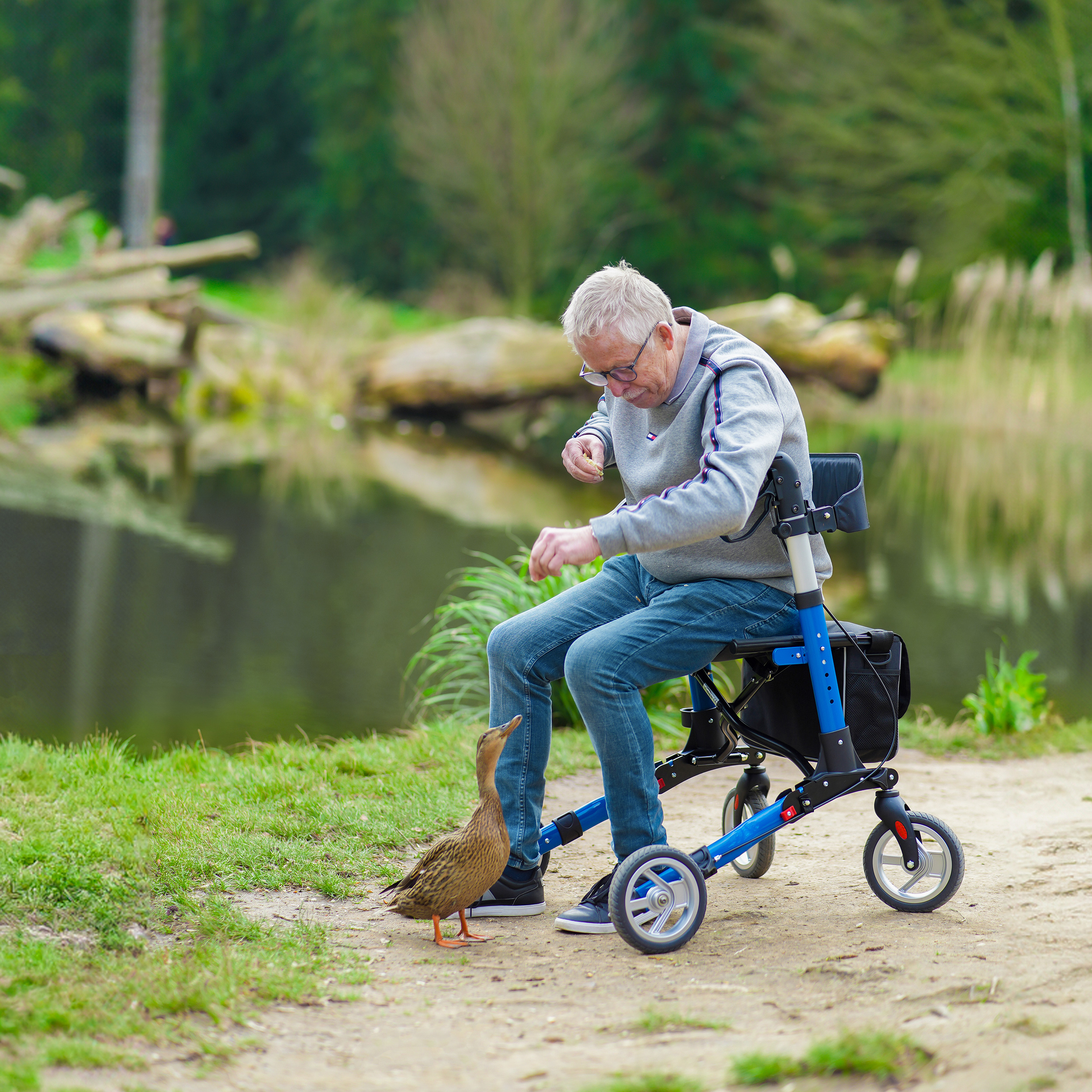 Mais ce n'est pas tout : grâce au mécanisme de pliage intelligent, vous pouvez même plier le déambulateur sans effort pour le transformer en déambulateur de voyage compact, de la taille d'une valise. Il ne mesure alors que 65 x 32 x 43 cm et peut être transporté dans n'importe quelle petite voiture ou ne pas être considéré comme un bagage encombrant à l'aéroport. Vous pouvez ainsi utiliser votre déambulateur en vacances pour des excursions ou des visites. Grâce à l'assise confortable, vous pouvez vous reposer de temps en temps et profiter du coucher de soleil le soir.